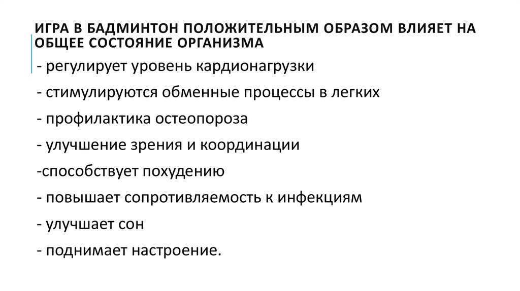 ИГРА В БАДМИНТОН ПОЛОЖИТЕЛЬНЫМ ОБРАЗОМ ВЛИЯЕТ НАОБЩЕЕ СОСТОЯНИЕ ОРГАНИЗМА