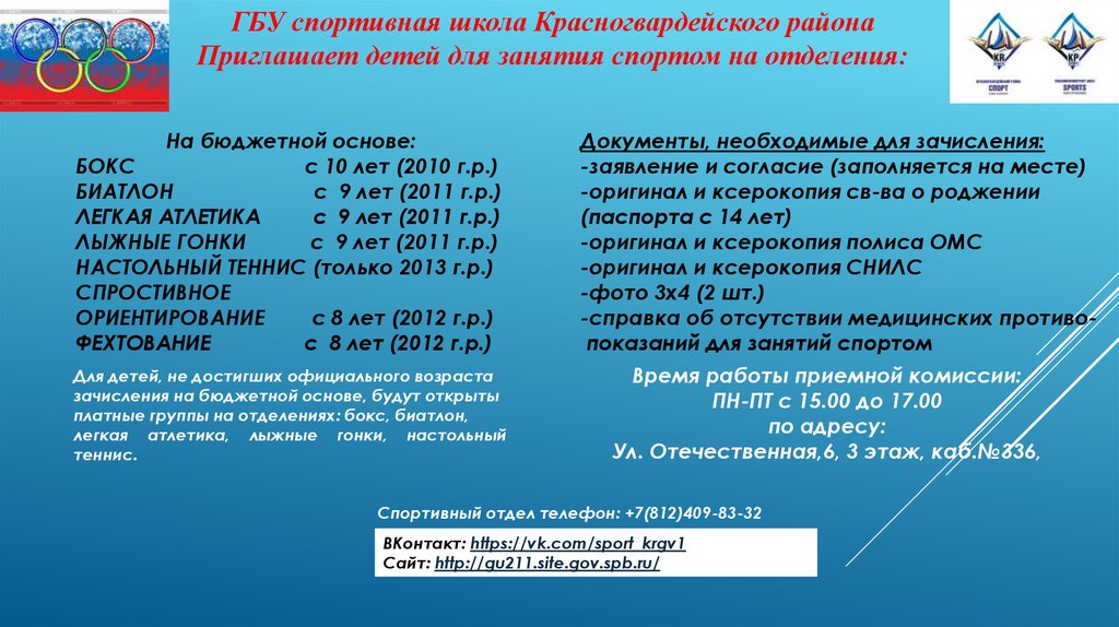 ГБУ спортивная школа Красногвардейского районаПриглашает детей для занятия спортом на отделения: