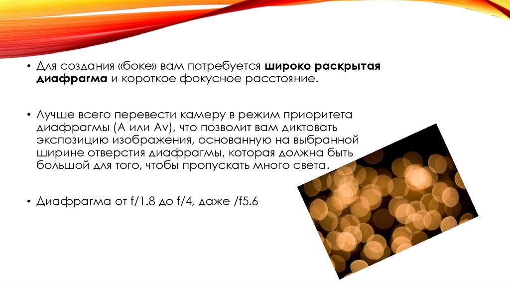 • Для создания «боке» вам потребуется широко раскрытаядиафрагма и короткое фокусное расстояние.