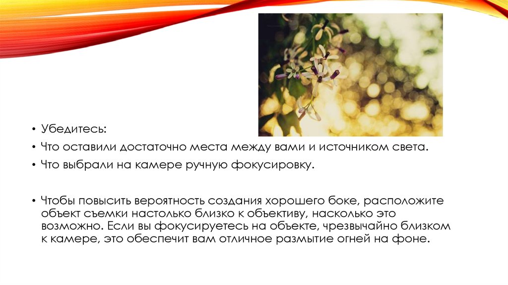 • Чтобы повысить вероятность создания хорошего боке, расположите