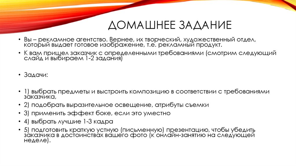ДОМАШНЕЕ ЗАДАНИЕ• Вы – рекламное агентство. Вернее, их творческий, художественный отдел,