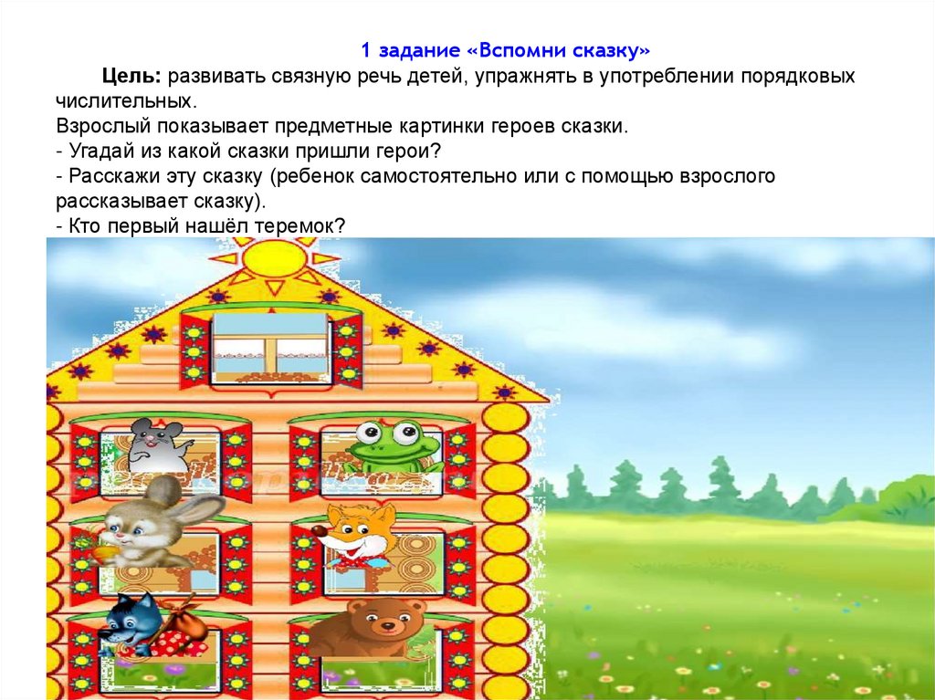 1 задание «Вспомни сказку»Цель: развивать связную речь детей, упражнять в употреблении порядковых