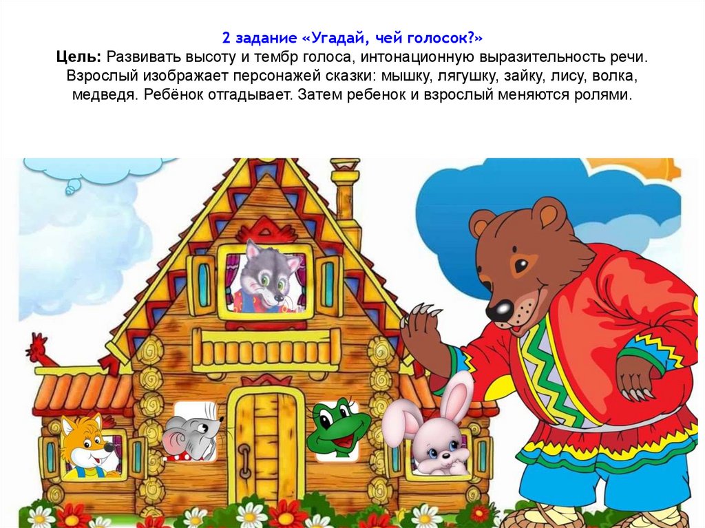 2 задание «Угадай, чей голосок?»Цель: Развивать высоту и тембр голоса, интонационную выразительность речи.