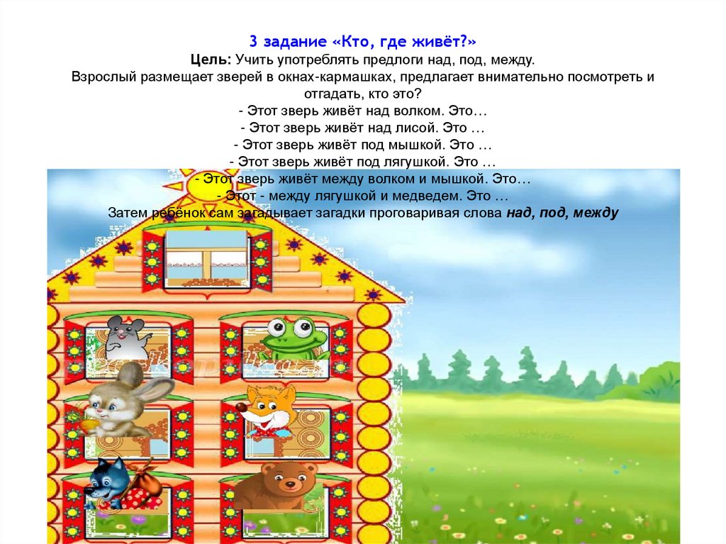 3 задание «Кто, где живёт?»Цель: Учить употреблять предлоги над, под, между.
