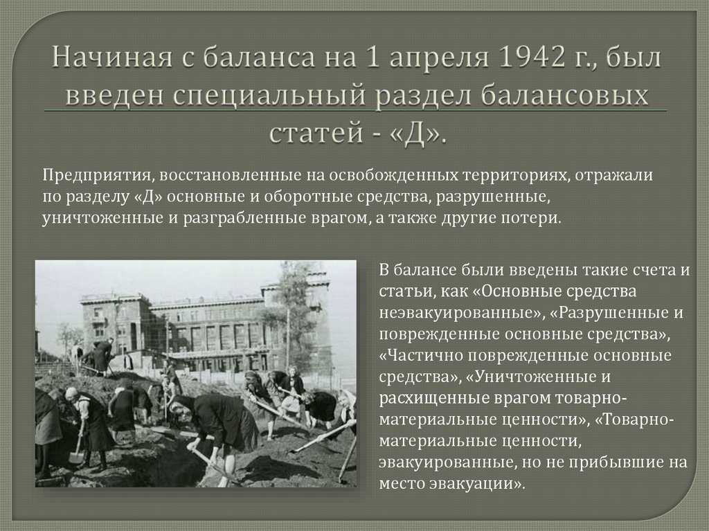 Предприятия, восстановленные на освобожденных территориях, отражалипо разделу «Д» основные и оборотные средства, разрушенные,