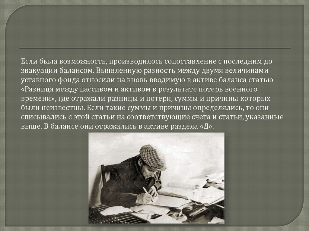 Если была возможность, производилось сопоставление с последним доэвакуации балансом. Выявленную разность между двумя величинами