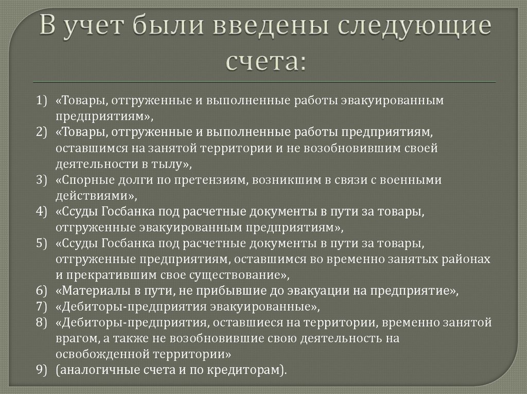 1) «Товары, отгруженные и выполненные работы эвакуированнымпредприятиям»,