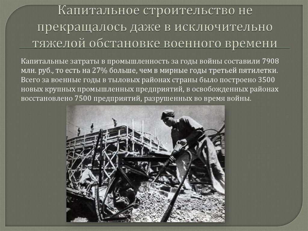 Капитальные затраты в промышленность за годы войны составили 7908млн. руб., то есть на 27% больше, чем в мирные годы третьей пятилетки.