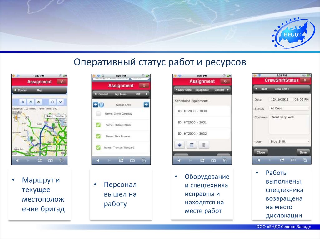 Оперативный статус работ и ресурсов• Маршрут и