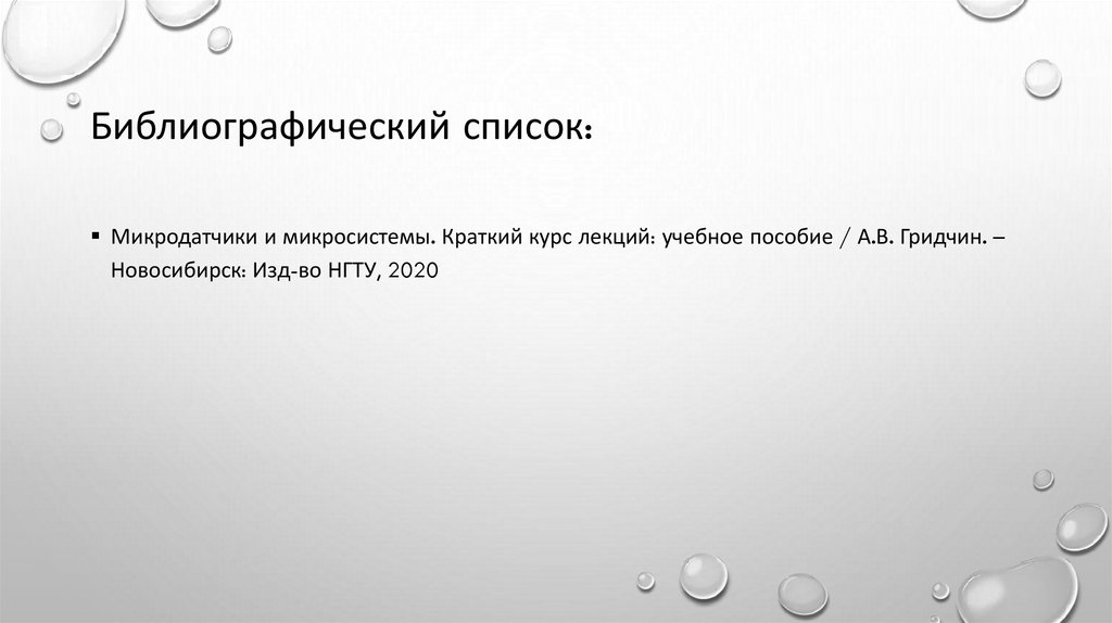 Библиографический список:Микродатчики и микросистемы. Краткий курс лекций: учебное пособие / А.В. Гридчин. –