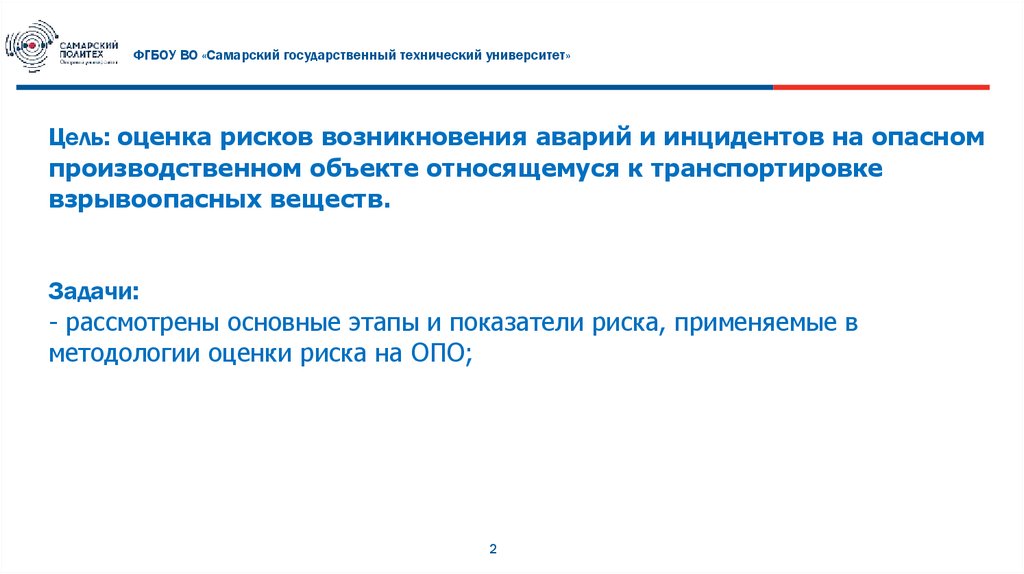 ФГБОУ ВО «Самарский государственный технический университет»Цель: оценка рисков возникновения аварий и инцидентов на опасном