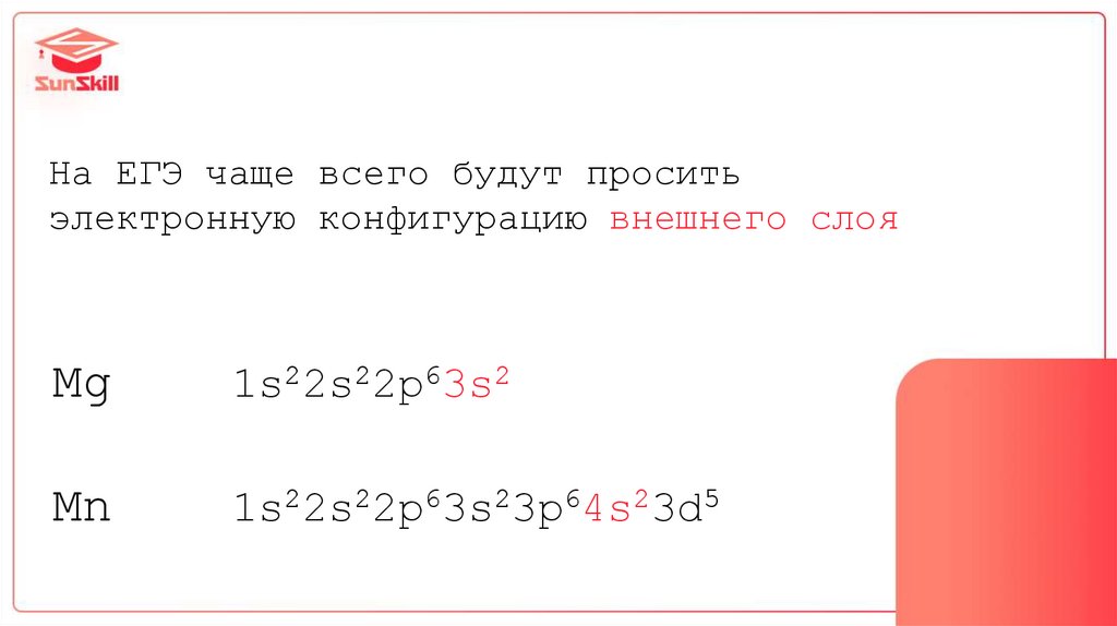 На ЕГЭ чаще всего будут проситьэлектронную конфигурацию внешнего слоя