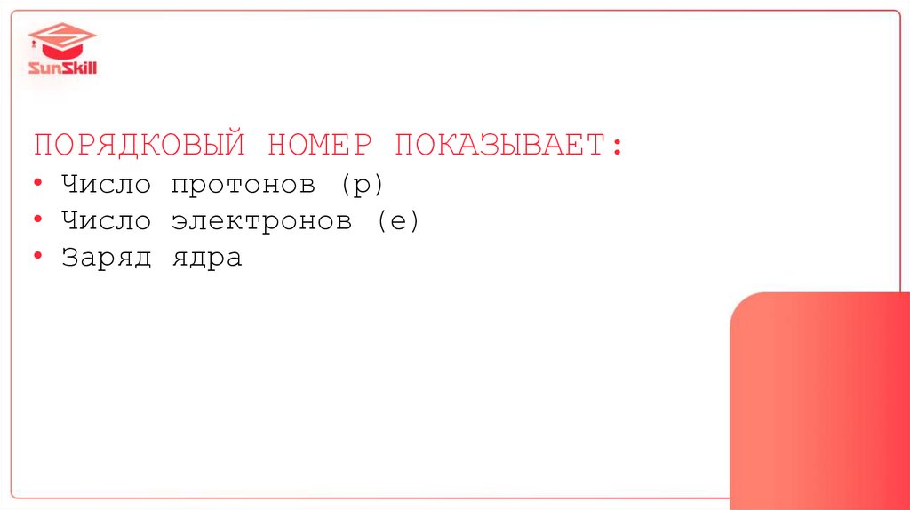ПОРЯДКОВЫЙ НОМЕР ПОКАЗЫВАЕТ:• Число протонов (p)