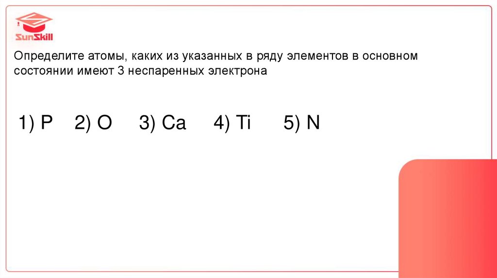 Определите атомы, каких из указанных в ряду элементов в основномсостоянии имеют 3 неспаренных электрона