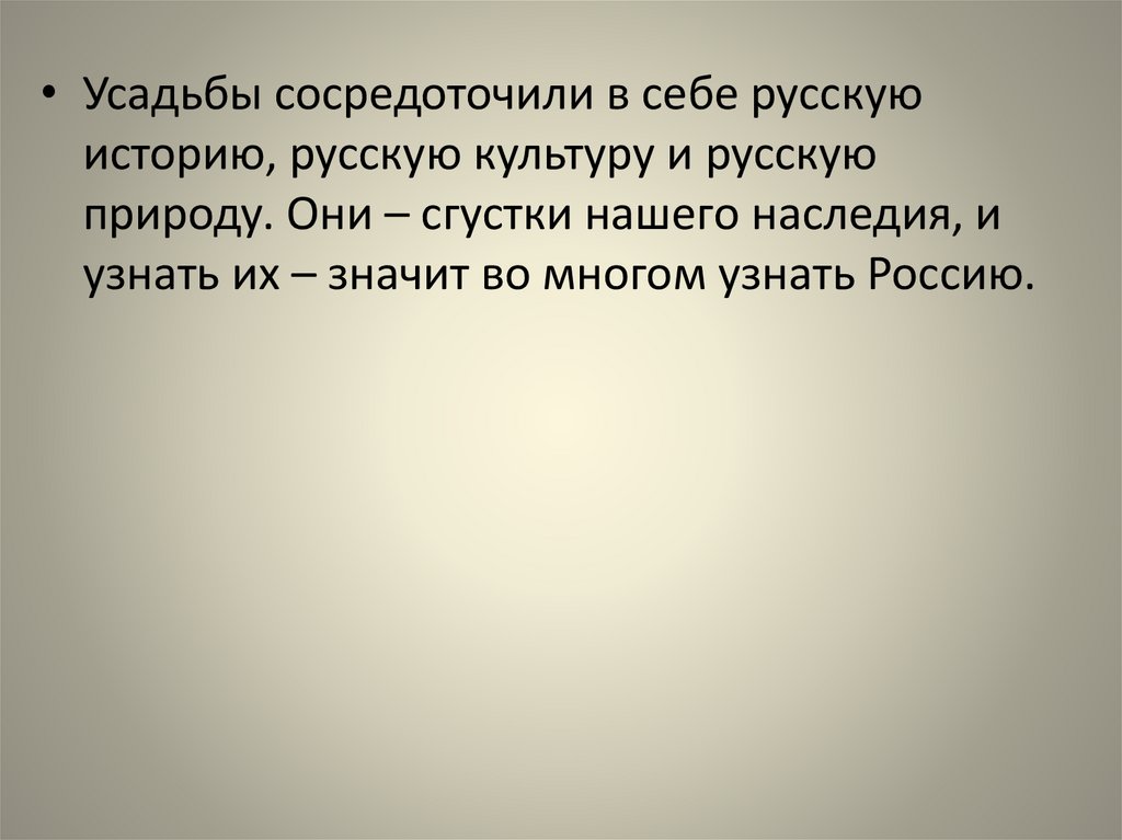 • Усадьбы сосредоточили в себе русскуюисторию, русскую культуру и русскую