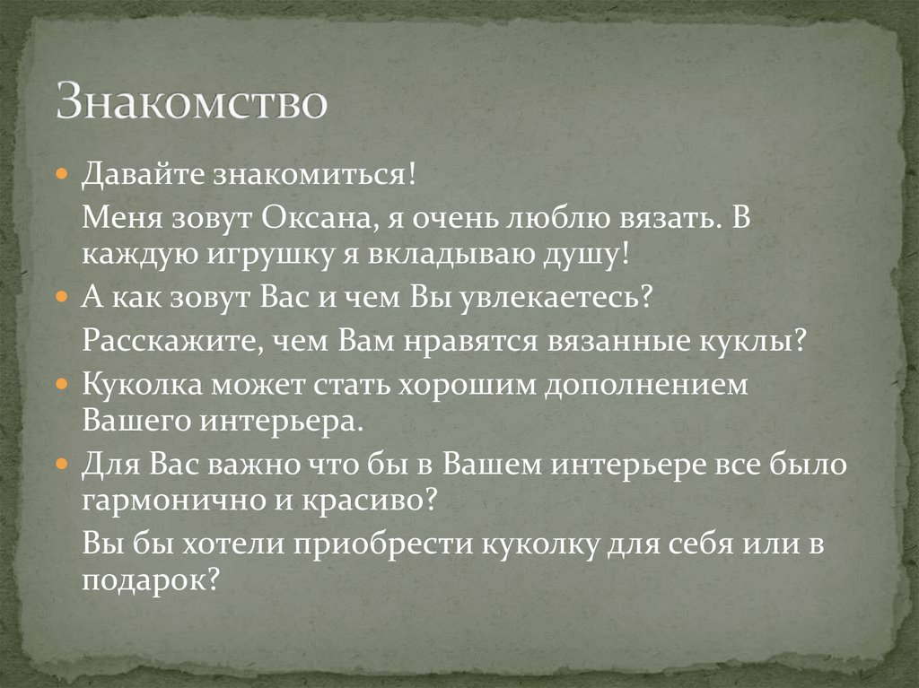 Давайте знакомиться!Меня зовут Оксана, я очень люблю вязать. В