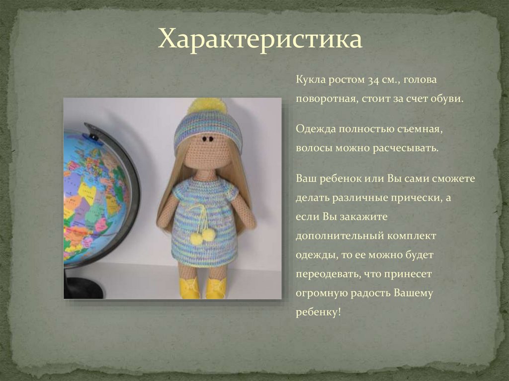 ХарактеристикаКукла ростом 34 см., голова