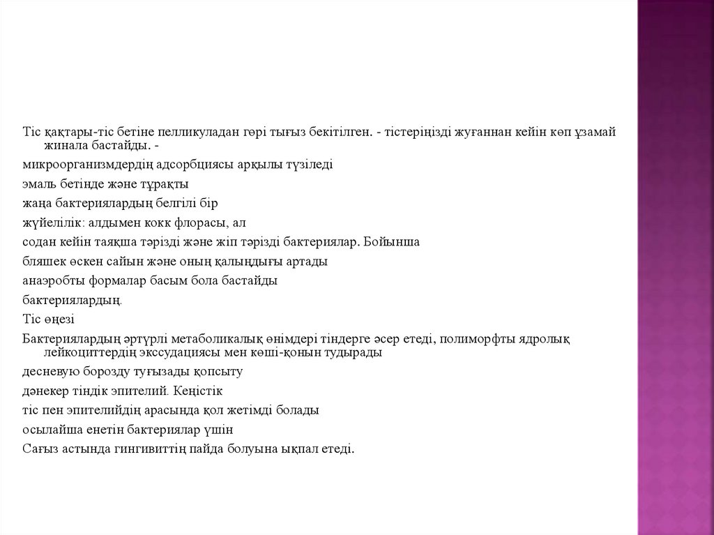 Тіс қақтары-тіс бетіне пелликуладан гөрі тығыз бекітілген. - тістеріңізді жуғаннан кейін көп ұзамайжинала бастайды. микроорганизмдердің адсорбциясы арқылы түзіледі
