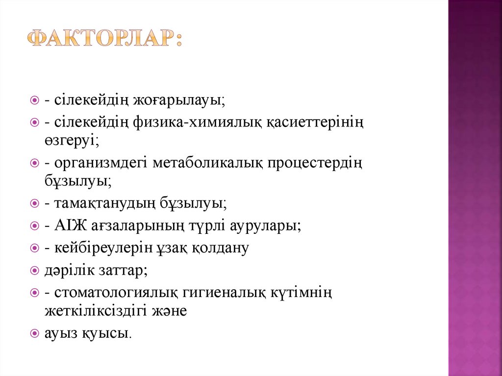 - сілекейдің жоғарылауы;- сілекейдің физика-химиялық қасиеттерінің
