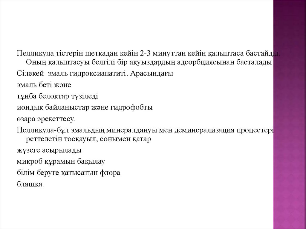 Пелликула тістерін щеткадан кейін 2-3 минуттан кейін қалыптаса бастайды.Оның қалыптасуы белгілі бір ақуыздардың адсорбциясынан басталады