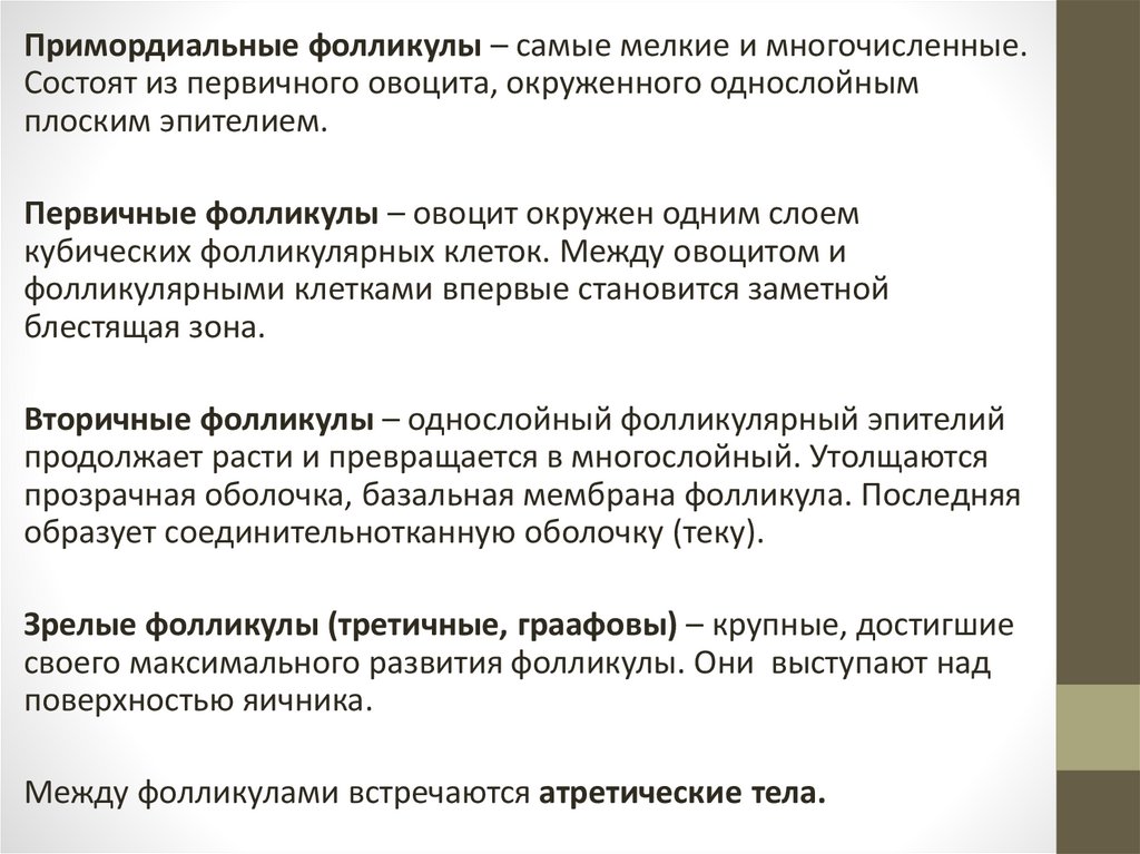 Примордиальные фолликулы – самые мелкие и многочисленные.Состоят из первичного овоцита, окруженного однослойным