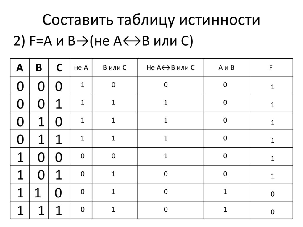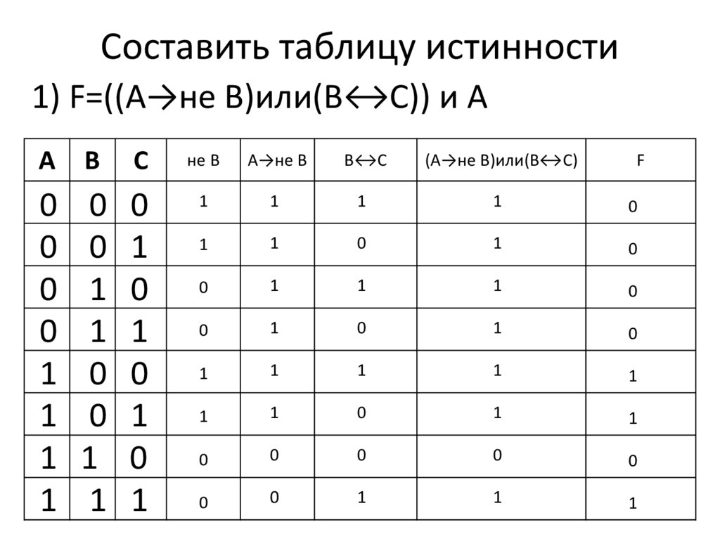 Составить таблицу истинности1) F=((А→не В)или(В↔С)) и А