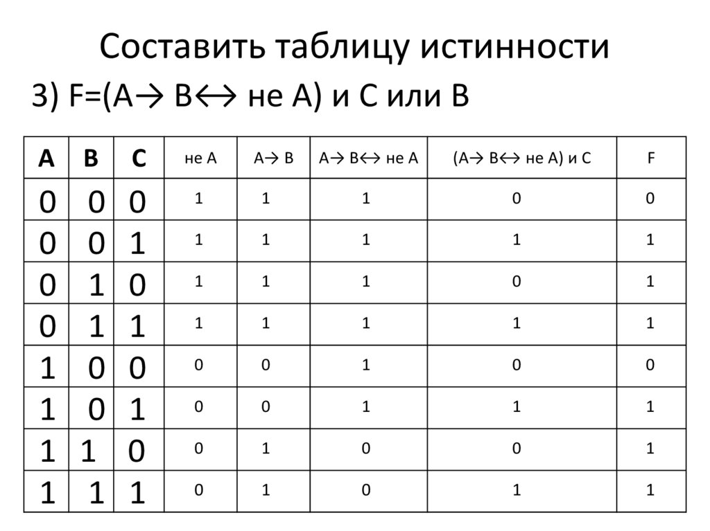 Составить таблицу истинности3) F=(А→ В↔ не А) и С или В
