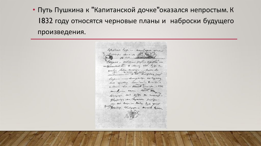 • Путь Пушкина к "Капитанской дочке"оказался непростым. К1832 году относятся черновые планы и наброски будущего
