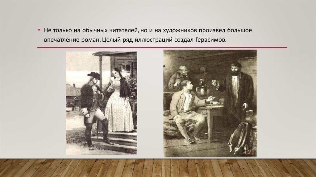 • Не только на обычных читателей, но и на художников произвел большоевпечатление роман. Целый ряд иллюстраций создал Герасимов.
