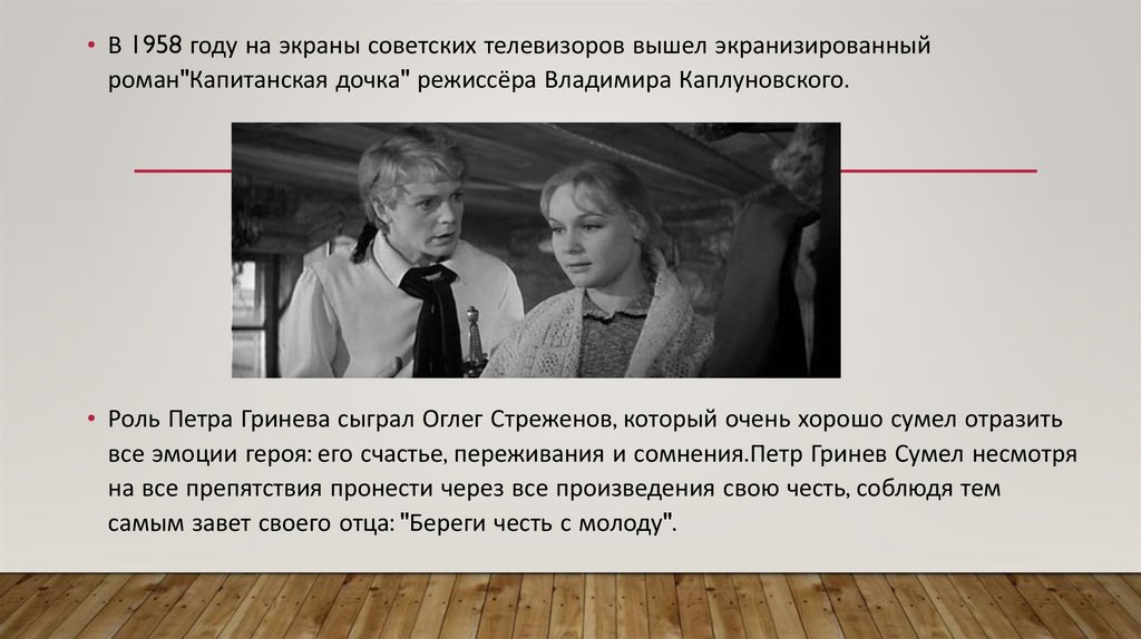 • В 1958 году на экраны советских телевизоров вышел экранизированныйроман"Капитанская дочка" режиссёра Владимира Каплуновского.