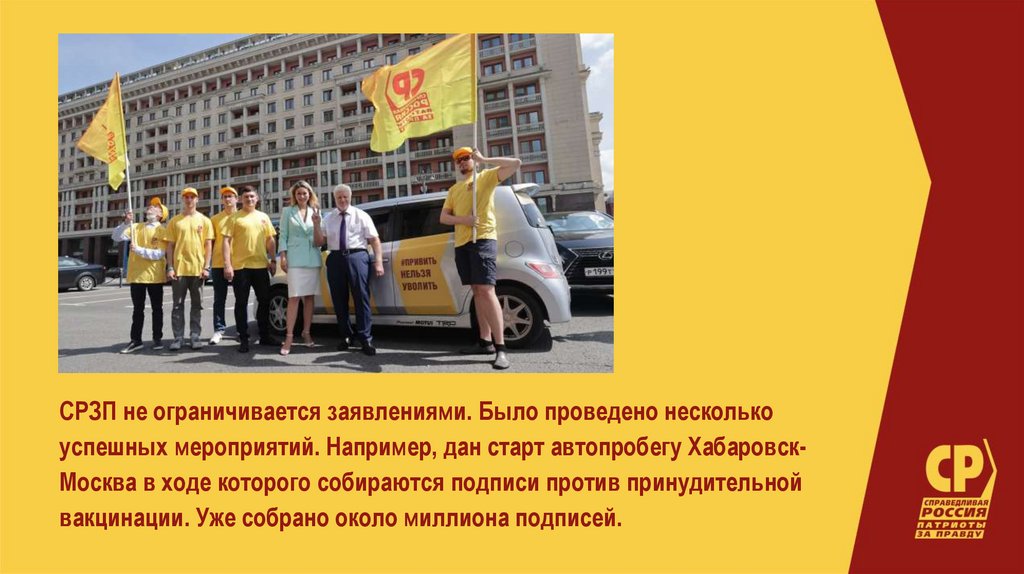 СРЗП не ограничивается заявлениями. Было проведено несколькоуспешных мероприятий. Например, дан старт автопробегу ХабаровскМосква в ходе которого собираются подписи против принудительной
