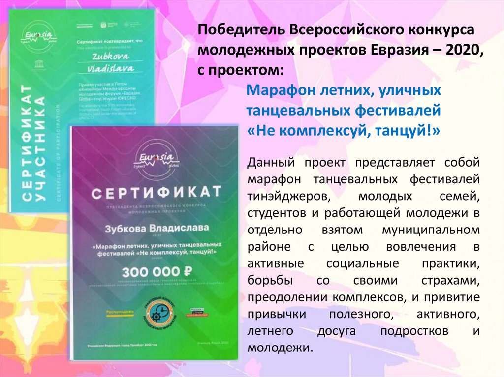 Победитель Всероссийского конкурсамолодежных проектов Евразия – 2020,
