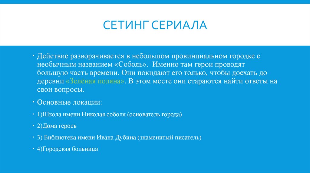 СЕТИНГ СЕРИАЛАДействие разворачивается в небольшом провинциальном городке с