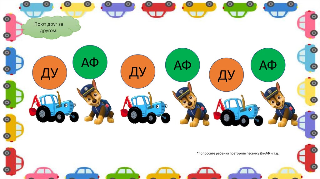 *попросите ребенка повторить песенку Ду-АФ и т.д.
