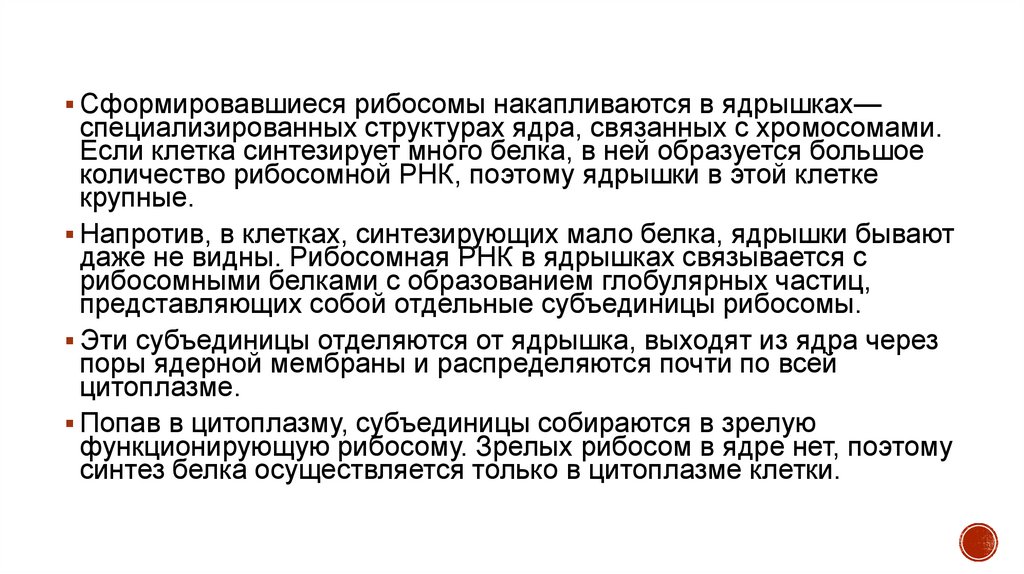 Сформировавшиеся рибосомы накапливаются в ядрышках—специализированных структурах ядра, связанных с хромосомами.