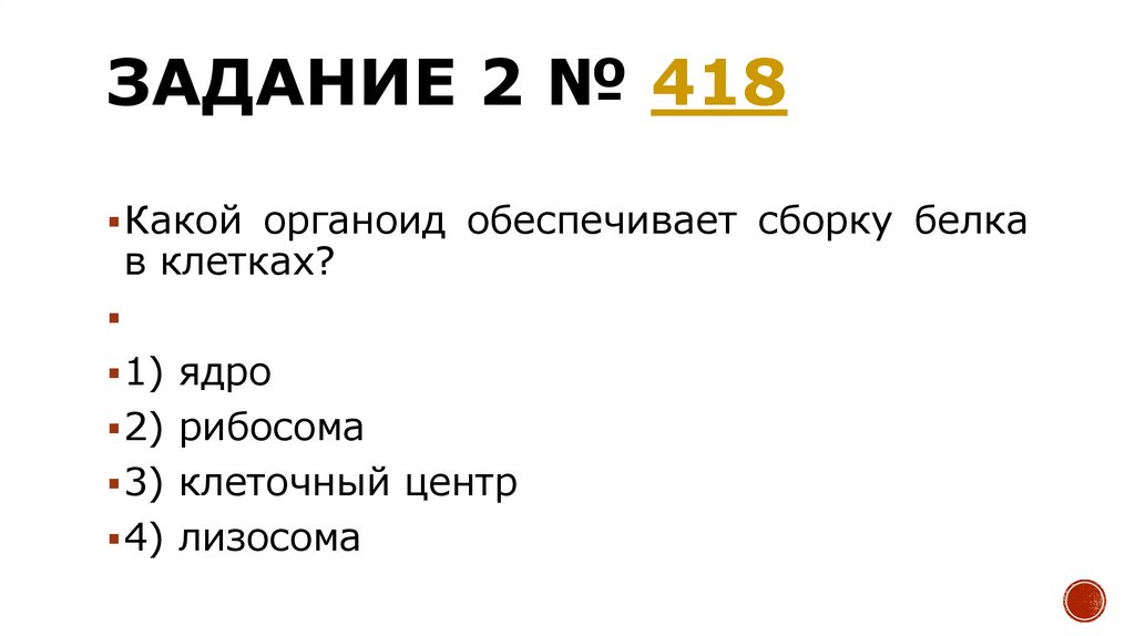ЗАДАНИЕ 2 № 418Какой органоид обеспечивает сборку белка
