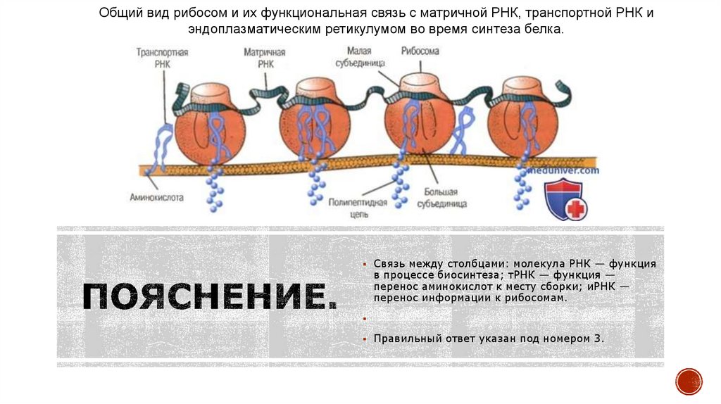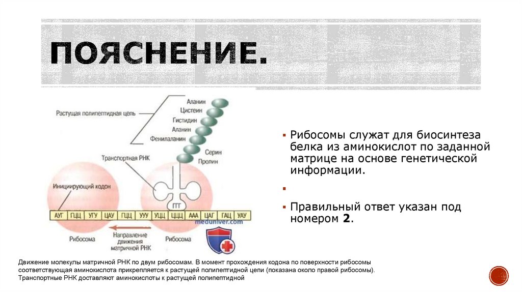 соответствующая аминокислота прикрепляется к растущей полипептидной цепи (показана около правой рибосомы).