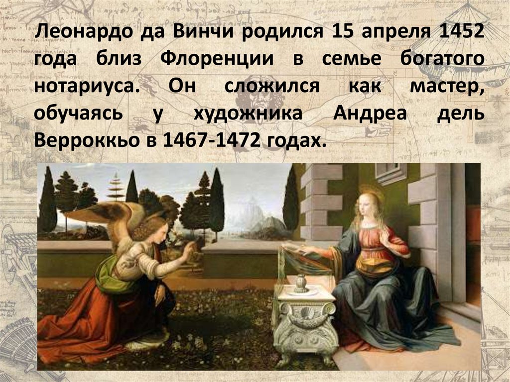 Леонардо да Винчи родился 15 апреля 1452года близ Флоренции в семье богатого