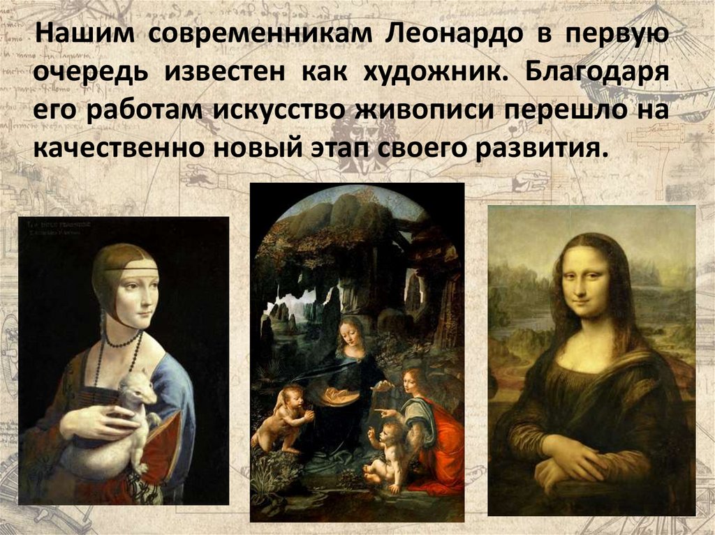 Нашим современникам Леонардо в первуюочередь известен как художник. Благодаря