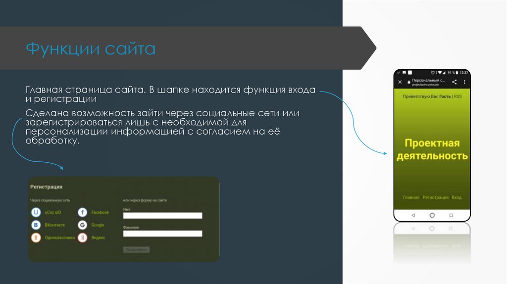 Функции сайтаГлавная страница сайта. В шапке находится функция входа
