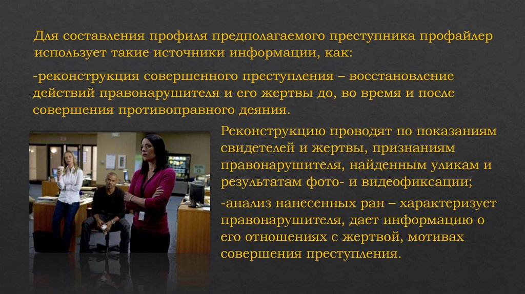 Реконструкцию проводят по показаниямсвидетелей и жертвы, признаниям