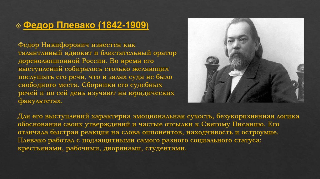 Федор Никифорович известен какталантливый адвокат и блистательный оратор