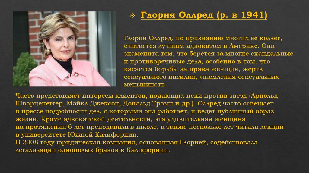 Глория Оллред, по признанию многих ее коллег,считается лучшим адвокатом в Америке. Она