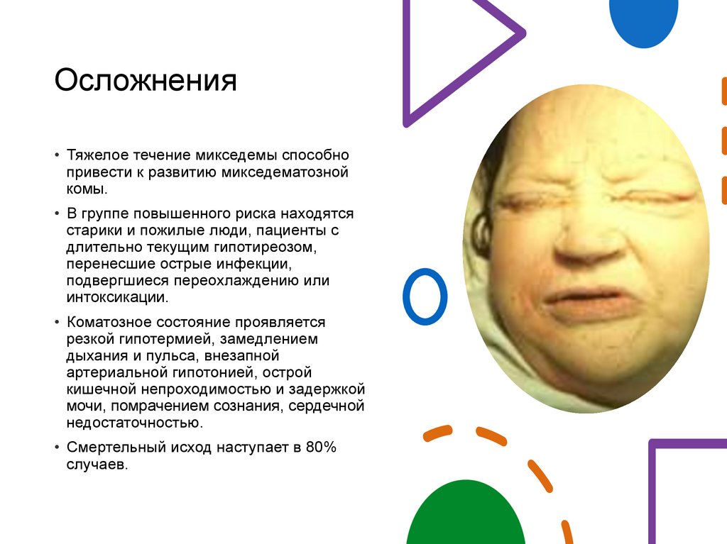 Осложнения• Тяжелое течение микседемы способно
