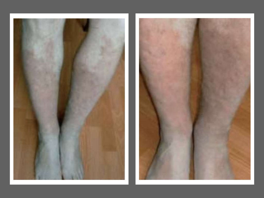 на передней поверхности обеих голеней, где имеются диффузные очаги с неправильной