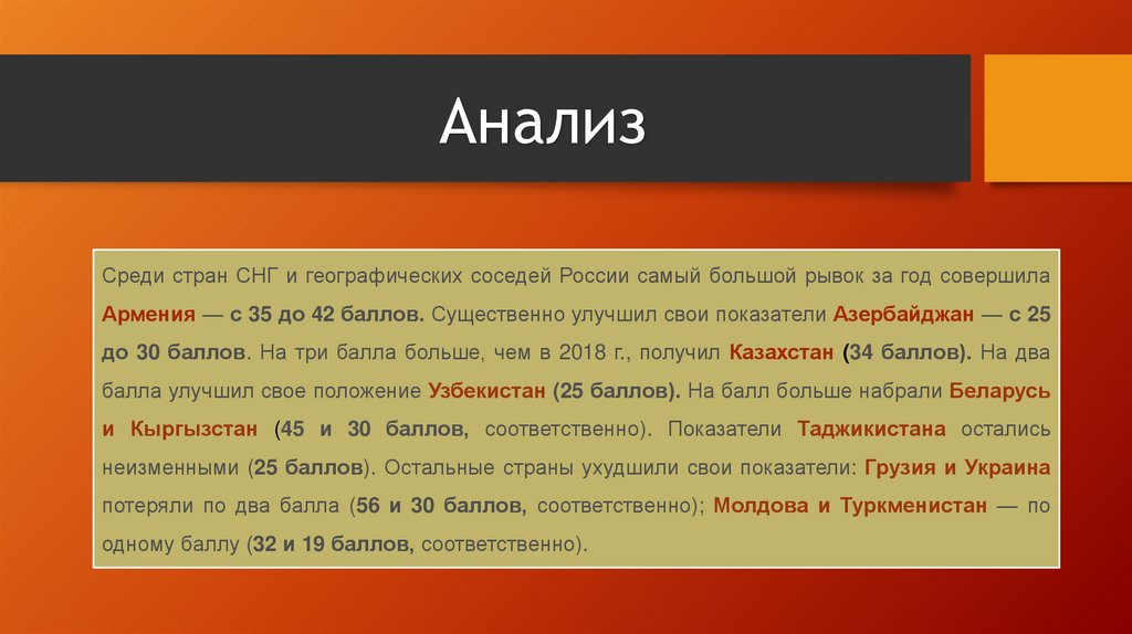 до 30 баллов. На три балла больше, чем в 2018 г., получил Казахстан (34 баллов). На два