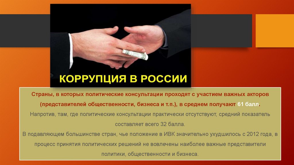 Страны, в которых политические консультации проходят с участием важных акторов(представителей общественности, бизнеса и т.п.), в среднем получают 61 балл.
