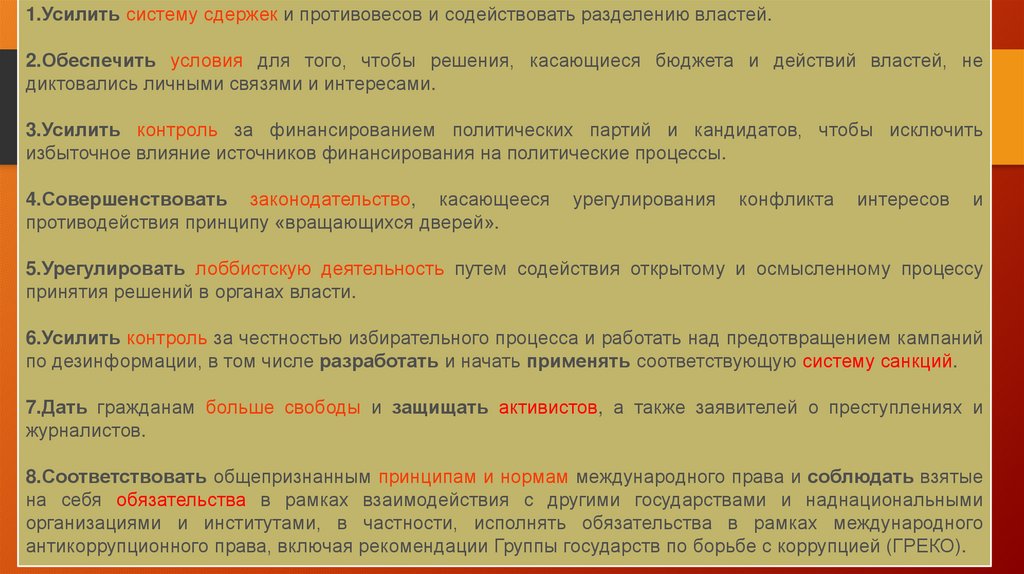 1.Усилить систему сдержек и противовесов и содействовать разделению властей.2.Обеспечить условия для того, чтобы решения, касающиеся бюджета и действий властей, не