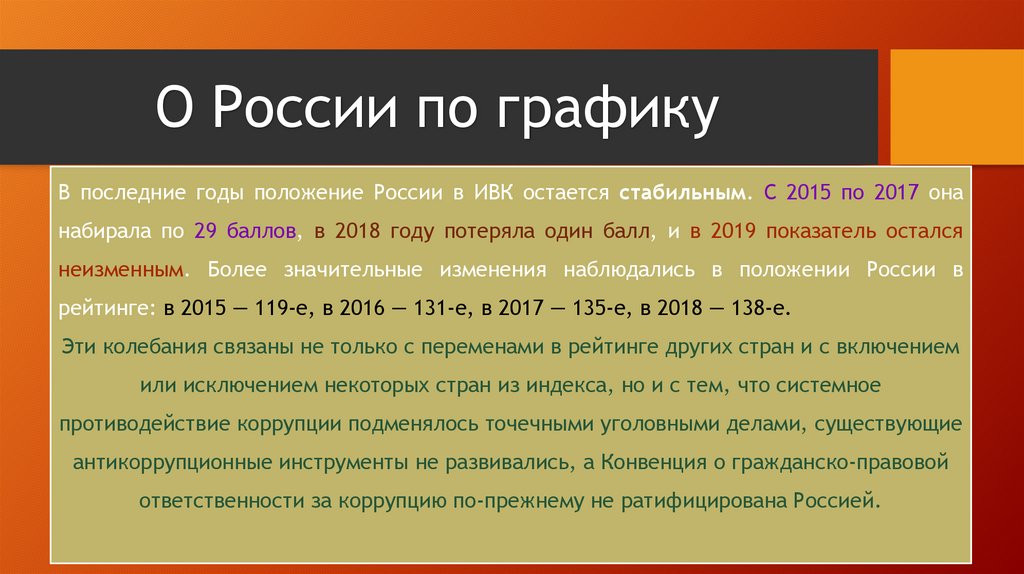 О России по графикуВ последние годы положение России в ИВК остается стабильным. С 2015 по 2017 она