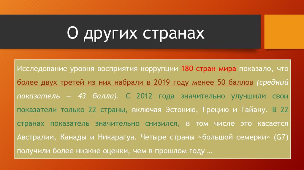 О других странахИсследование уровня восприятия коррупции 180 стран мира показало, что